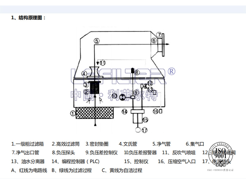 自潔過程: 含塵空氣氣經過濾后,塵埃被吸附在高效過濾筒上,由 PLC 按設定時間順序進行反吹自潔過程, 當阻損值超過 600 帕時,由 PLC 按差壓順序控制反吹自潔過程(反吹時間為 0.1-0.2 秒)。其它高效過濾筒照常工作,塵埃被反吹自潔下來。
