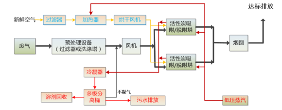吸附過程:廢氣經(jīng)空氣過濾器除去微小懸浮顆粒后進入罐內(nèi),通過填裝在罐內(nèi)的顆粒狀活性炭(或活性炭纖維)吸附過濾后再由后置風機排空(如氣體的濃度較高時可采用多節(jié)吸附裝置,保證氣體達標排放)。