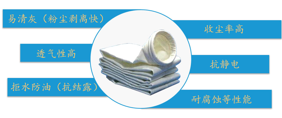 濾袋采用玻纖基布和化學纖維混合針刺而成。產品具有耐磨性能好、抗拉強度高。正常使用溫度150℃,短時180℃。適用于溫度適宜、煙塵濃度高、過濾要求高的煙塵過濾行業。1、表面未完濾效率高:通常工業用濾材是深層過濾。它是依賴于在濾材表面先建立一次粉塵層而達到過濾。建立過濾時間長,阻力大,效率低,截留不   ,過濾和反吹壓力高,清灰頻繁,能耗較高,使用壽命不長,設備占地面積大。使用覆膜除塵濾袋濾料,粉塵不能透入濾料,是表面過濾,無論是粗,細粉塵,全部沉積在濾料表面,即靠膜本身孔徑截留被濾物,無初濾期,開始就是過濾,近的時間處于過濾。